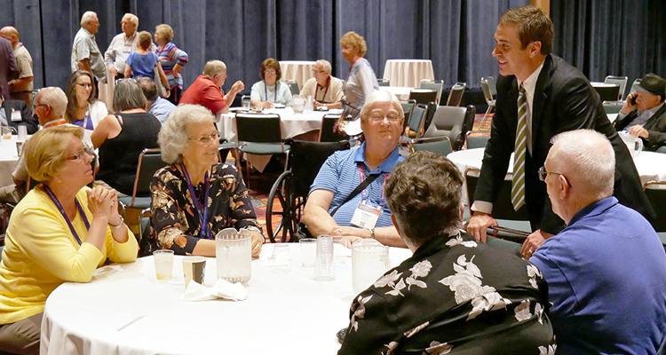 Le surintendant général David A. Busic discute avec des retraités à la Réception de reconnaissance de clergy retraité des États-Unis.