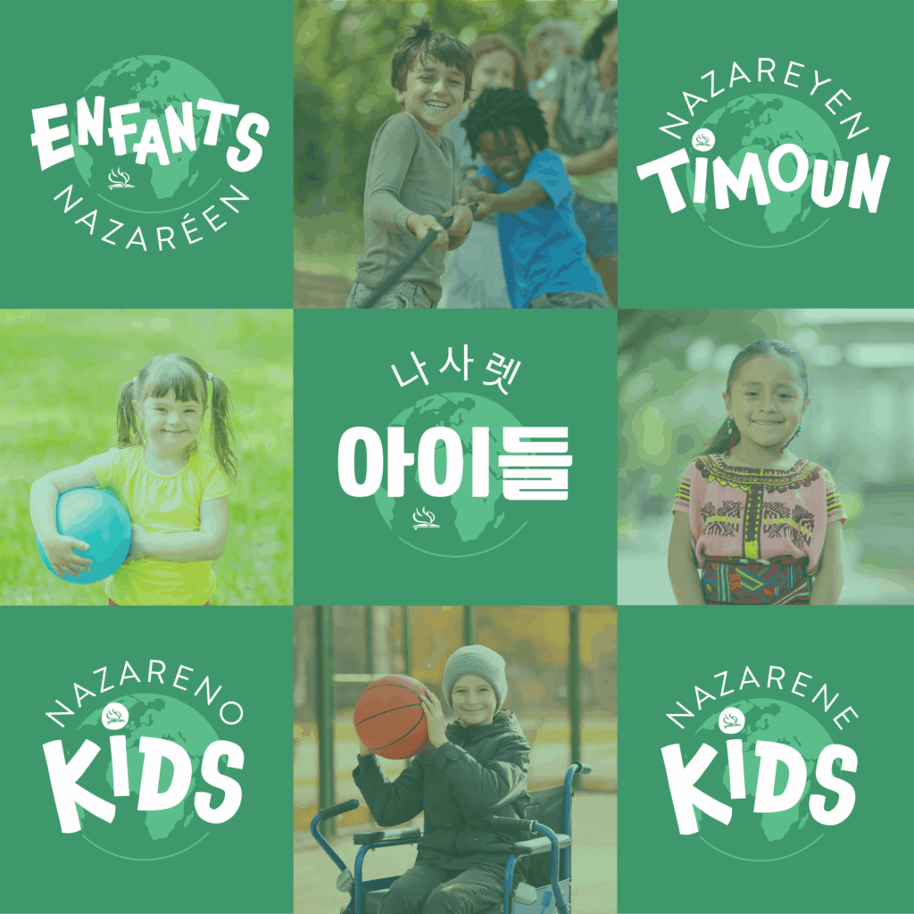 The Nazarene Kids logo is available in English, Español, Français, Kreyól Ayisyen, Portugués, and 한국인. In addition, it is available for each global region: Africa, América del Sur, Asia-Pacific, Eurasia, Mesoamérica, and USA/Canada.