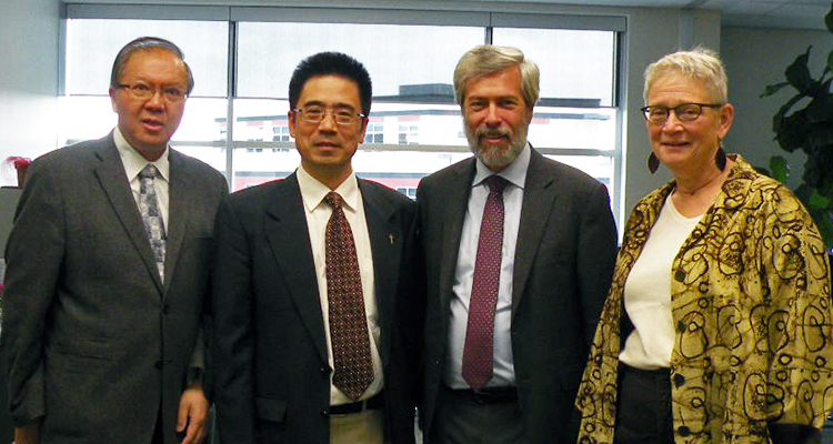 From left to right: Jason Yeung, Ambrose professor of systematic theology; Ambroise Aiming Wang, Nanjing Union Theological Seminary vice president; Gordon T. Smith, Ambrose president; Jo–Ann Badley, Ambrose dean of theology