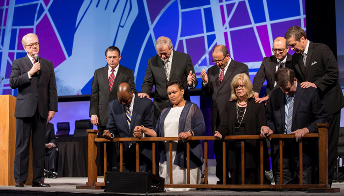 Later, Fili and Samantha Chambo and Carla and Chuck Sunberg knelt at a wooden altar that’s been used by new general superintendents for generations. The current BGS prayed over the four, asking God to help them “lead the church in the power of Your Spirit.”