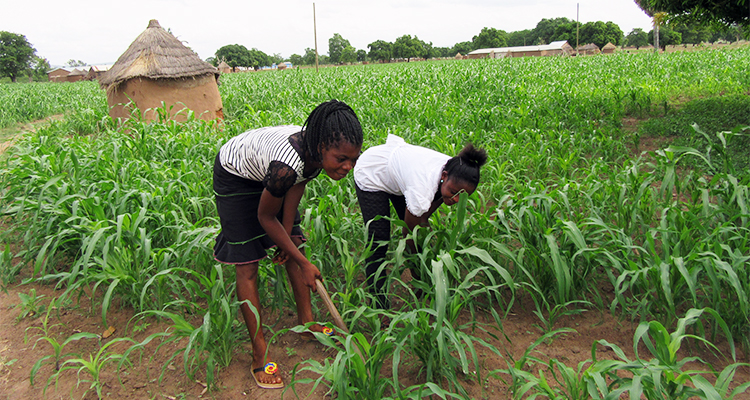 Esther (left) and Lucy (right) work on the club’s maize farm, which helps fund education and training for young women.