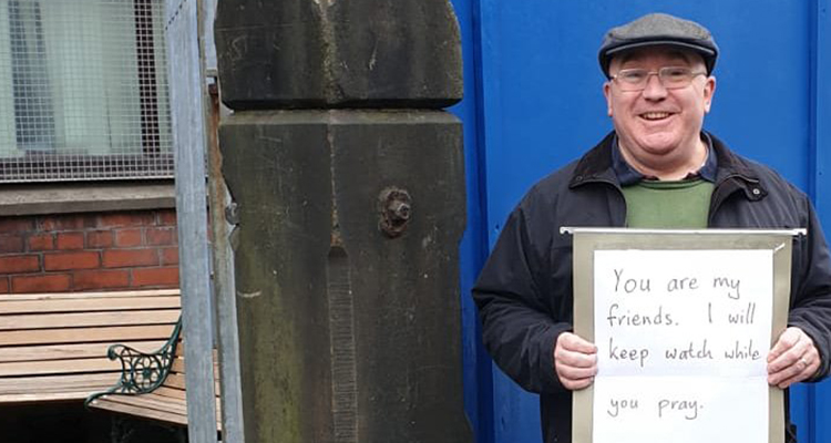 Graystone stood outside the Medina Mosque in Manchester, England, holding a sign that said “You are my friends. I will keep watch while you pray.”