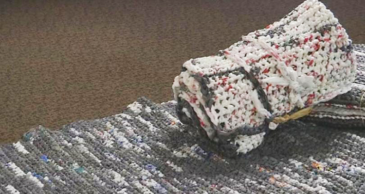 Members of the First Church of the Nazarene take plastic bags and turn them into sleeping mats.