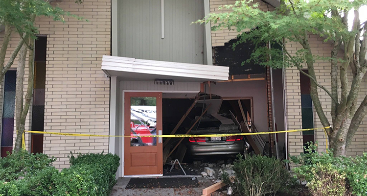 (KIRO7, September 4) A man crashed his car through the front of a Bellevue church Sunday morning, splintering wood and shattering glass.
