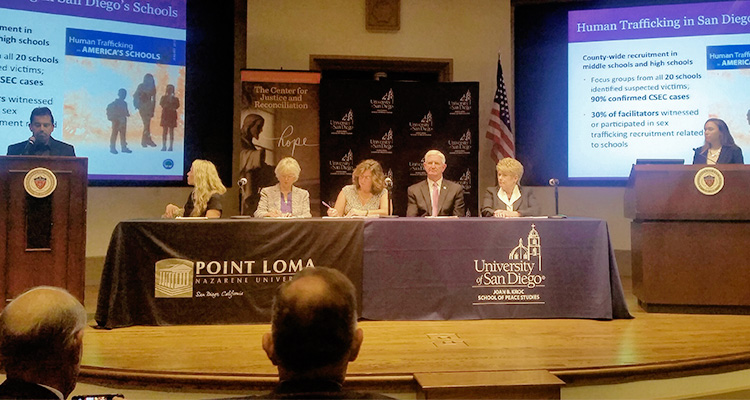 The surprising findings of a three-year study on gang-involved sex trafficking, funded by the Department of Justice, were released at 11 a.m., Monday, October 26 at a press conference at the University of San Diego in the Institute for Peace & Justice Theatre. The groundbreaking study, “Measuring the Nature and Extent of Gang Involvement in Sex Trafficking in San Diego,” led by University of San Diego (USD) Kroc School of Peace Studies Professor Ami C. Carpenter, Ph.D., in partnership with Point Loma Nazarene University (PLNU) Professor Jamie Gates, Ph.D., gathered and analyzed data from hundreds of current and former gang members, schools, law enforcement agencies, and victim service providers. Sheriff Bill Gore, District Attorney Bonnie Dumanis, County Supervisor Dianne Jacob, Generate Hope Founder Susan Munsey, and San Diego Unified School District Superintendent Cindy Marten also participated in the press conference.