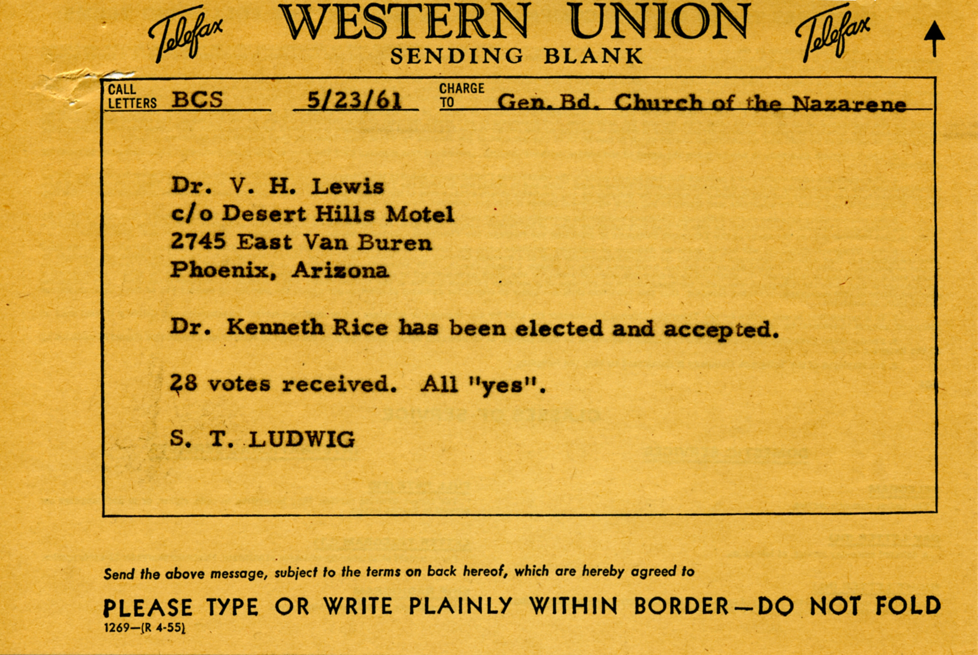On May 23, 1961, the Church of the Nazarene General Board elected Kenneth executive secretary of the Department of Church Schools. During his 15 years in the position, Kenneth led the denomination to record gains in Sunday school enrollment. He was also a prolific author, writing Sunday school curriculum, articles for the Herald of Holiness (now Holiness Today), and several books, including Sunday School: The Edge, How Sunday Schools Grow, and The Department Supervisor.