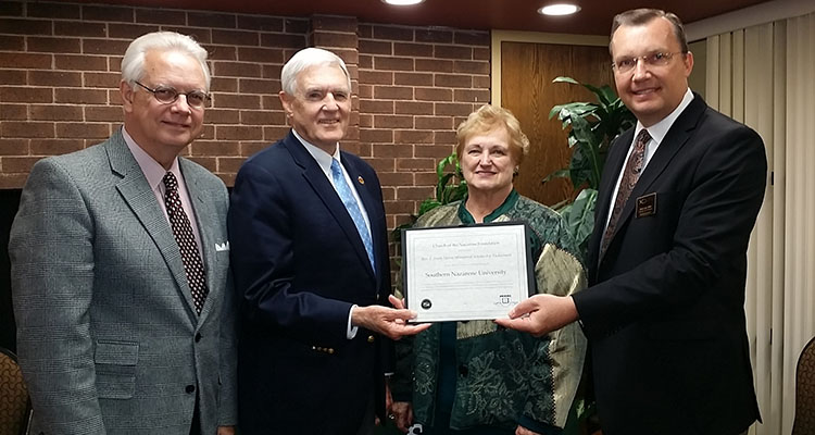Southern Nazarene University recently received $166,000 for the establishment of the F. Irwin Harris Ministerial Scholarship Endowment. The donation was presented by Church of the Nazarene Foundation Executive Vice President Mark Lail and Arlita Warrick Harris to Southern Nazarene University President Loren Gresham and Vice PresidentTerry Toler. The endowment will provide tuition scholarships to students who are preparing for full-time ministry in the Church of the Nazarene.