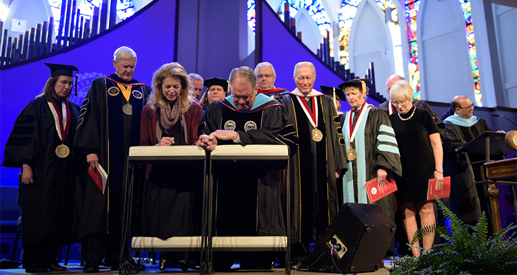 In a ceremony rich with symbolism, Newman’s emphasis on student engagement was made evident by their participation in key areas throughout the service. President Emeritus Gresham delivered the inaugural address, entitled “Keeping Faith With Our Founders,” and the ceremony of investiture featured a special presentation by Church of the Nazarene Education Commissioner Dan Copp and a dedicatory prayer by General Superintendent Gustavo A. Crocker.