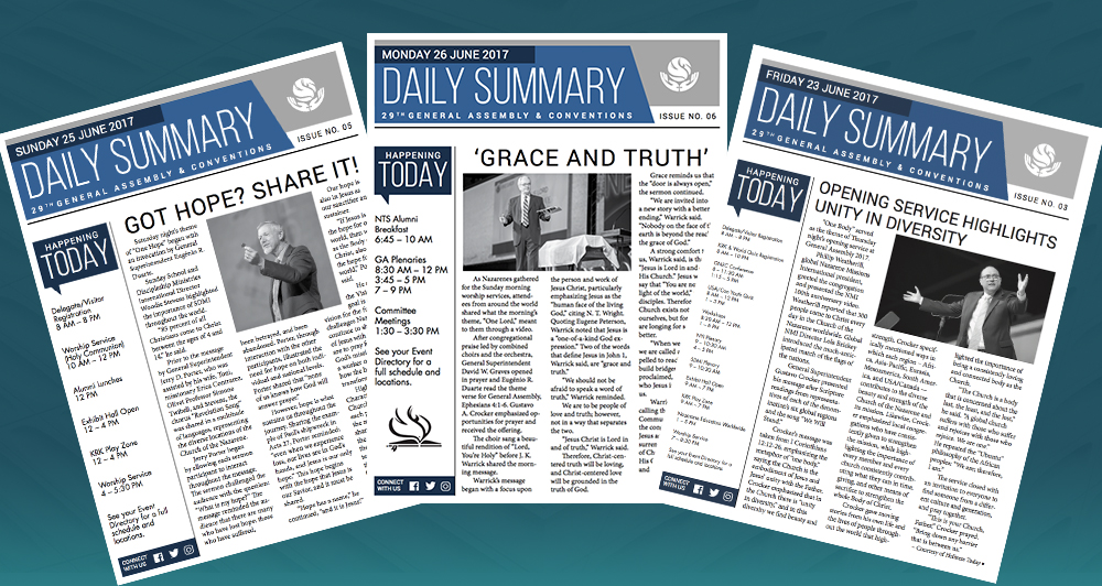 Siga notícias e atualizações com #GA2017 em mídia social ou assista à transmissão ao vivo da sessão plenária em nazarene.org/galive.